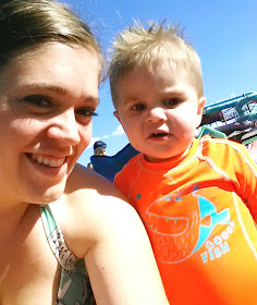 We started in the lazy river which Brooklyn loves. We didn't have tubes so we just walked/swam around the river. Brooklyn loves that she can touch but that there are steps in the river and she watches for them so she'll swim under the water when we come to them... not sure if that makes sense ha ha.  I do have to mention I forgot to put Gavin's swim diaper on when we got to the park so after being in the water for a while I remembered and we switched diapers... holy cow his diapers sure can hold a lot of water. I was so embarrassed I forgot to switch his diaper.